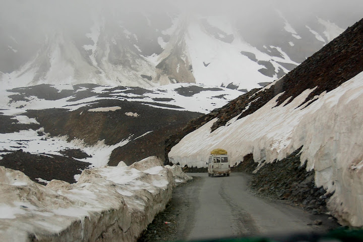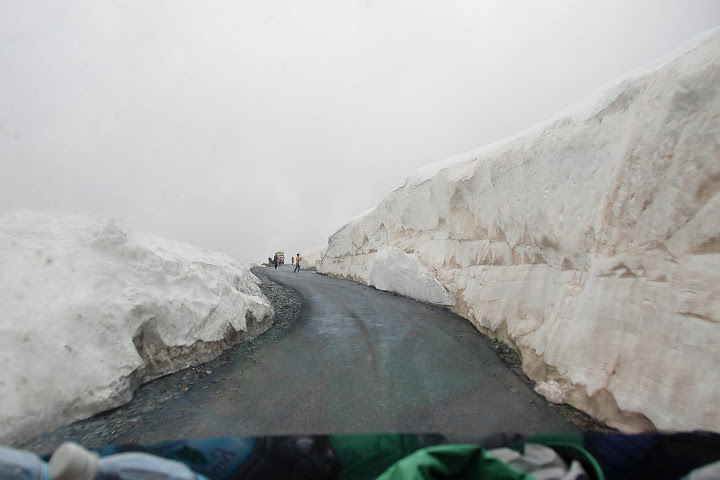 А дальше начался ледник. У одного из автобусов нашего каравана пробило колесо и мы встали среди снегов. Вот так каждую весну, то есть каждый июнь в горах военной техникой расчищают дорогу. Мы ехали 9 июля и обычно к этому времени ледники значительно меньше, но в этот раз весна задержалась.